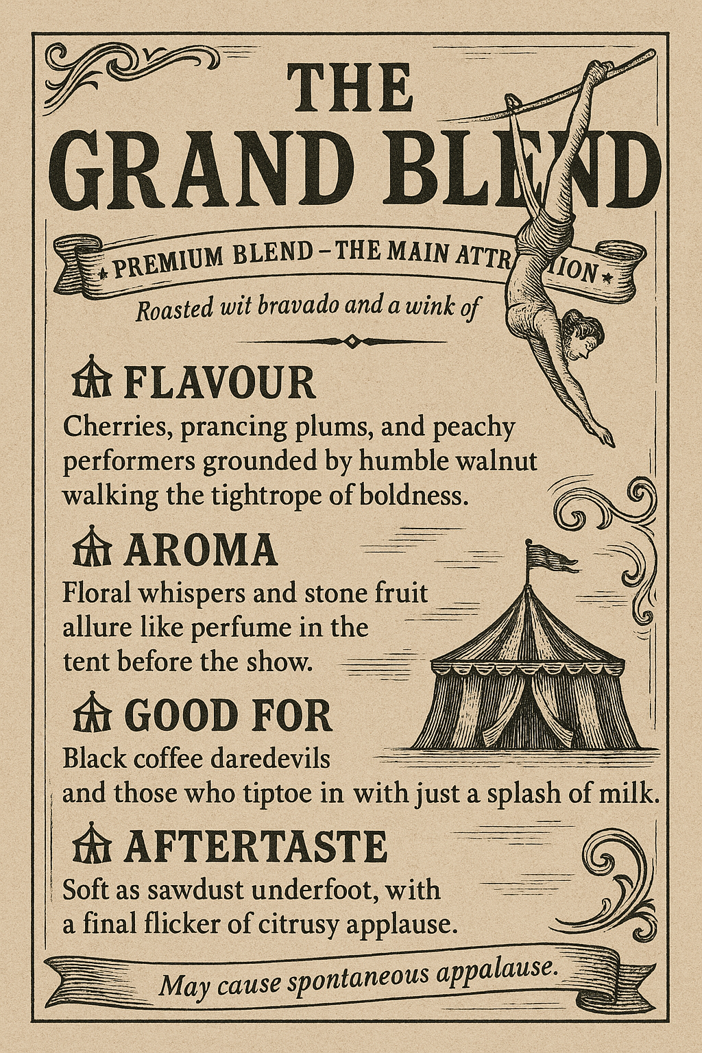 Ladies and gents, coffee lovers of all kinds — feast your senses on this show stopping premium blend! Delightful black or with just a hint of milk, this main attraction enchants with floral notes and a parade of stone fruits. Picture cherries swinging on the trapeze, peaches pirouetting on the high wire, and a walnuty undertone grounding the whole act. With a zesty acidity that takes a bow and a soft aftertaste that lingers like applause, this blend steals the spotlight — cup after cup.